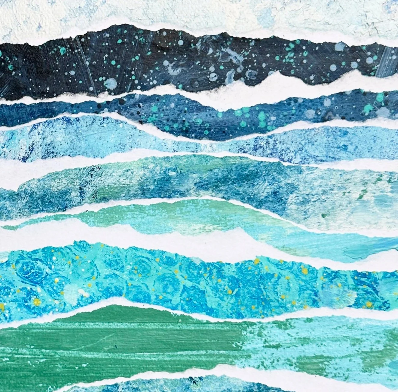 An abstract landscape painting created with torn papers. 7/8” depth canvas.